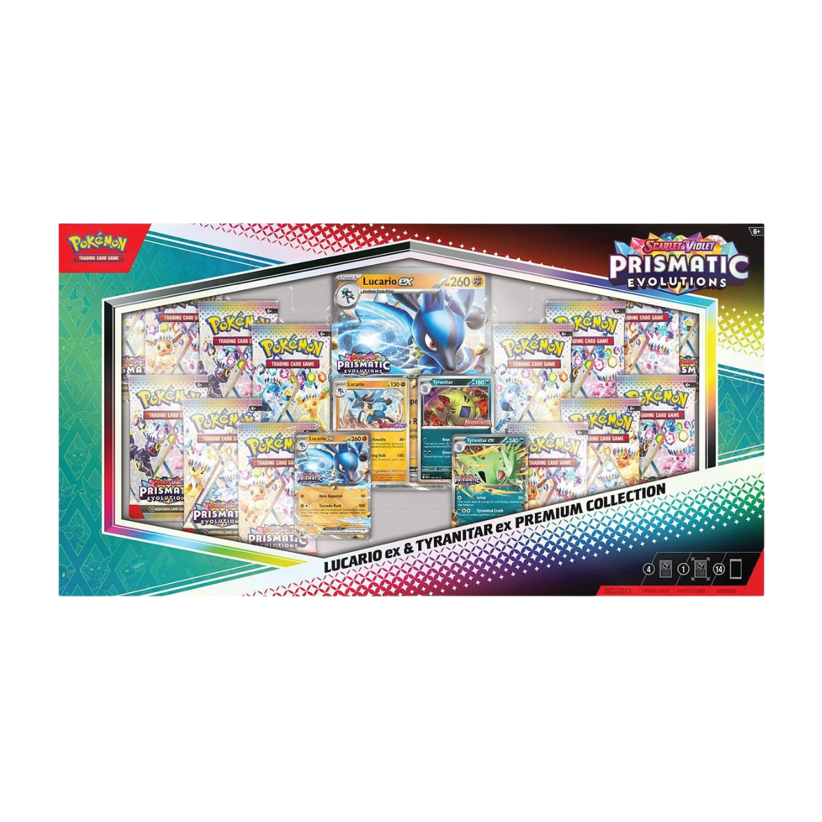 ✅ 2 foil promokaarten met Lucario ex en Tyranitar ex ✅ 2 foil promokaarten van Lucario en Tyranitar ✅ 1 oversized foil kaart van Lucario ex ✅ 14 Pokémon TCG: Scarlet & Violet – Prismatic Evolutions boosterpacks ✅ 1 codekaart voor Pokémon TCG Live