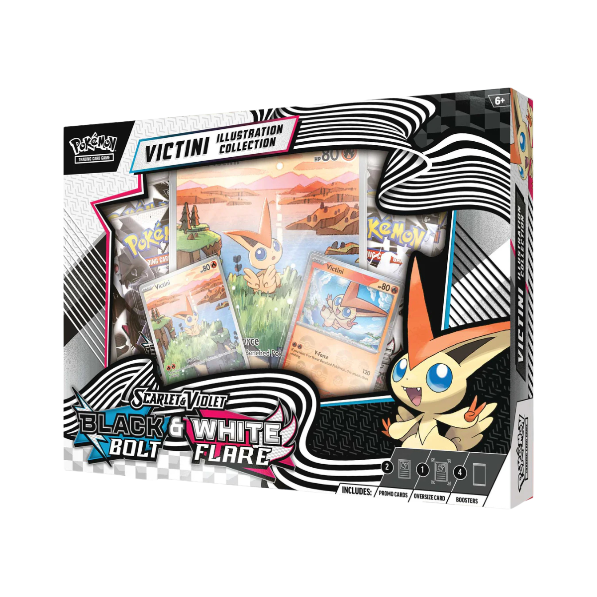 ✅ 4 Pokémon TCG: Scarlet & Violet—White Flare& Black Bolt boosterpakketten ✅ 1 extra grote Victini Illustration-kaart ✅ 2 promokaarten